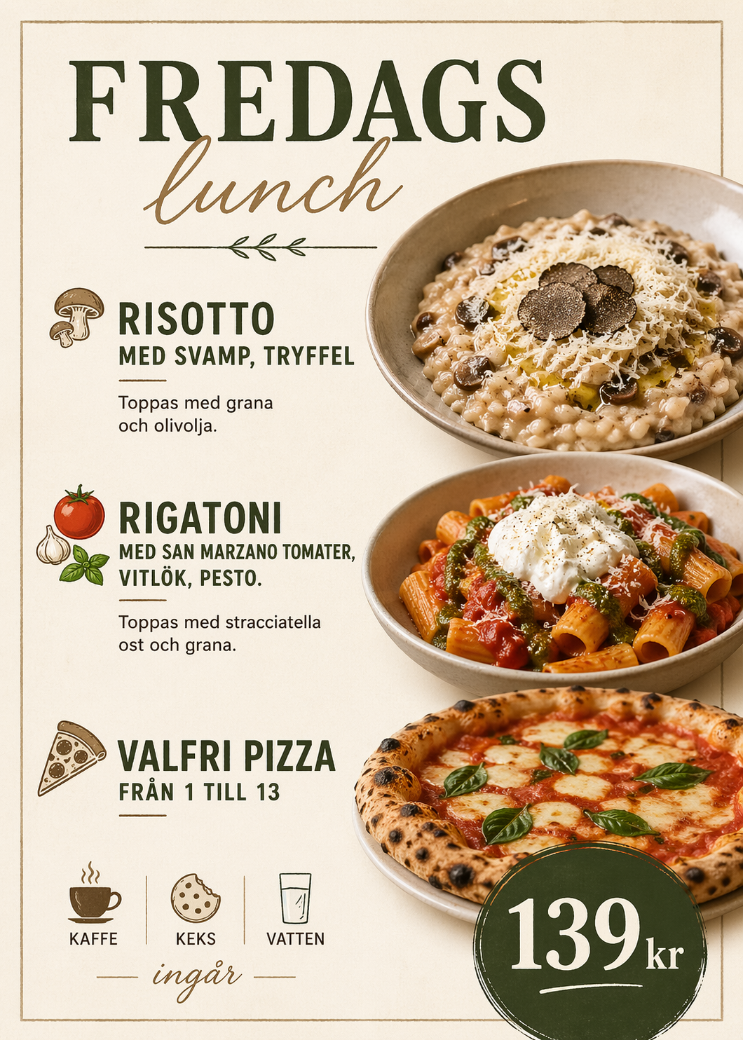 Da Riccardo har specialiserat sig på att producera och bearbeta traditionell pizza napoletana i Alingsås stad. Vår deg är gjord med högkvalitativa ingredienser och bakad i en hög temperaturugn, vilket resulterar i en utsökt och autentisk smak. Vi brinner för att upprätthålla traditionen och hantverket av pizza napoletana och strävar efter att ge den bästa upplevelsen för våra kunder.