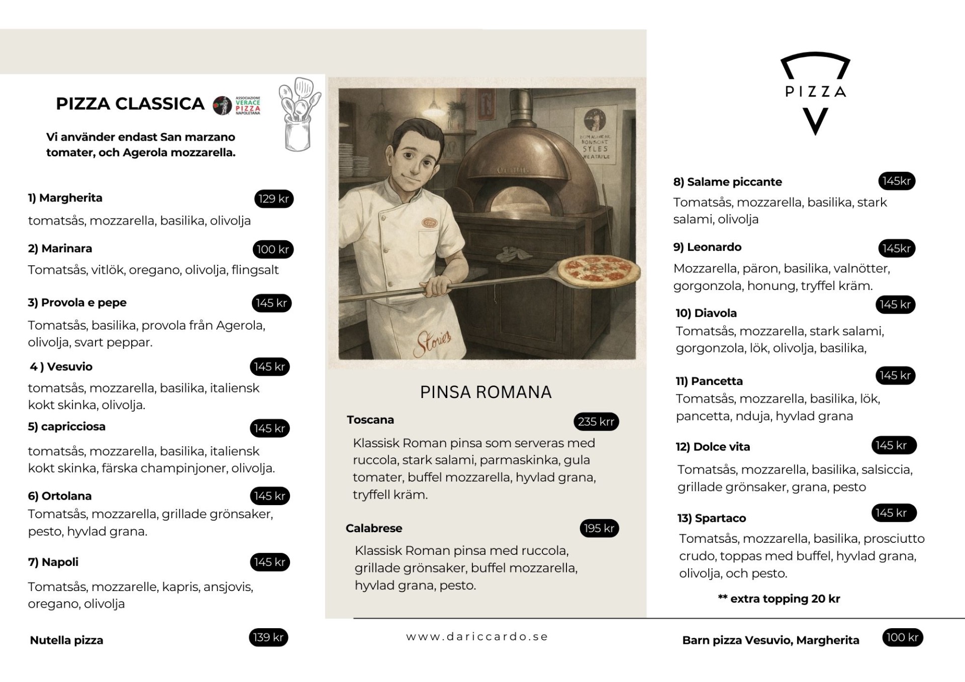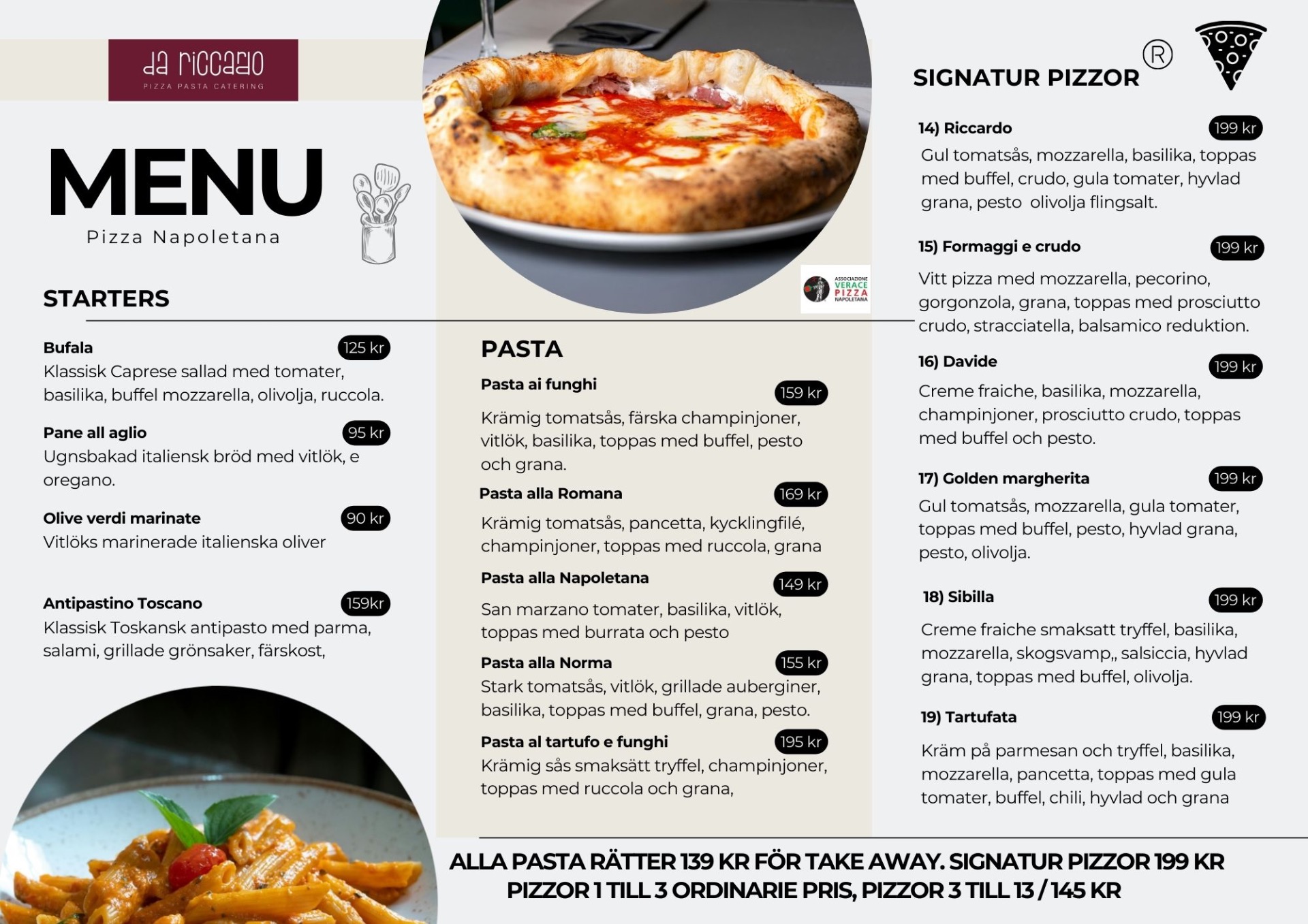 Pizzor 1 till 3 ordinarie pris . Pizzor 3 till 13 / 145 kr. Signatur pizzor 199 kr. Alla pasta rätter 139 kr